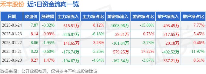 本站消息,截至2025年1月24日收盘,禾丰股份(603609)报收于7.87元,下跌3.32%,换手率0.87%,成交量8.04万手,成交额6352.22万元。