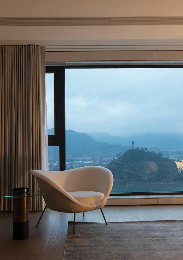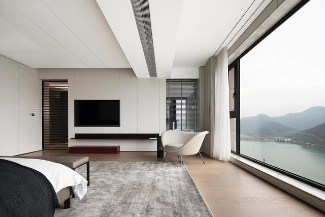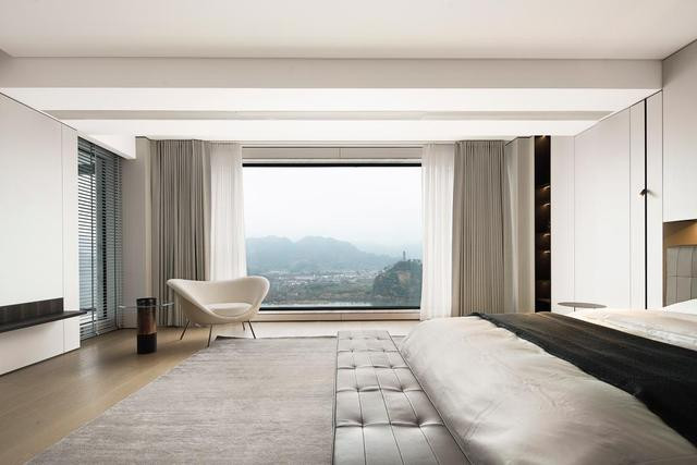 以静思为主题的主卧空间,将窗外的山水美景作为最独特的点缀。