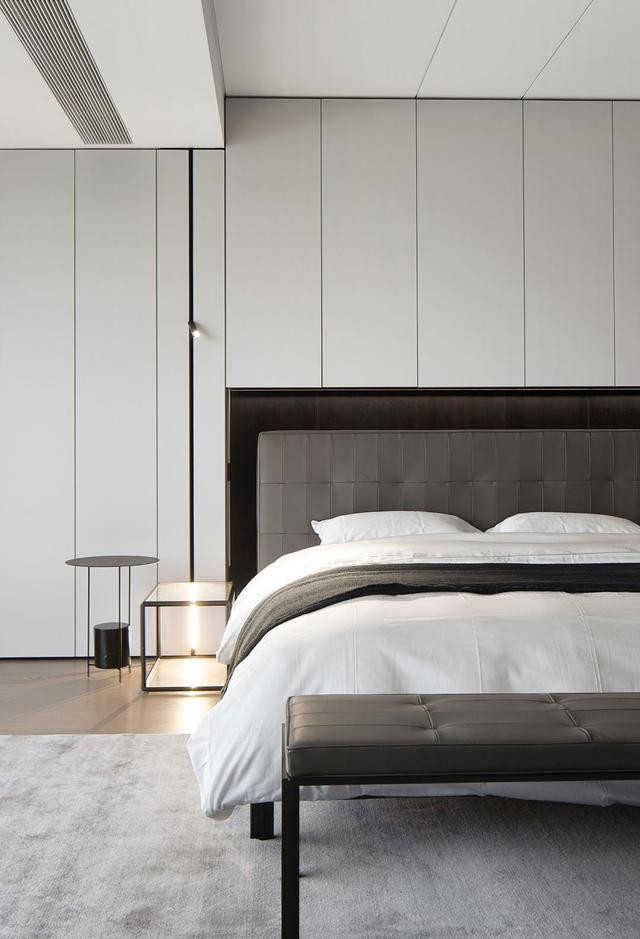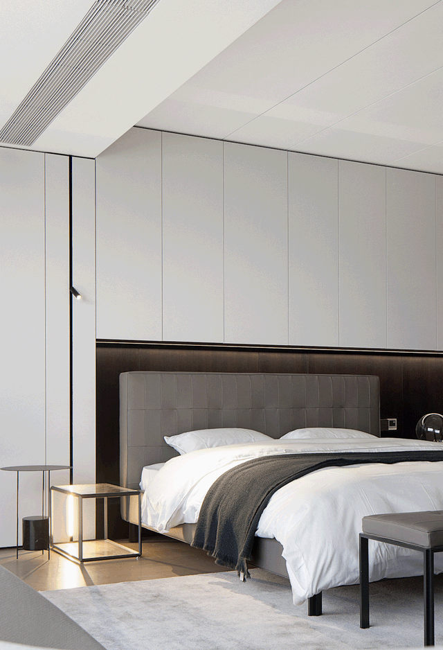 在材质与色调的搭配下,主卧不仅显露出简约低调的沉稳气质,更在柔软温情的内里中透露出平和、舒适与惬意的生活氛围。