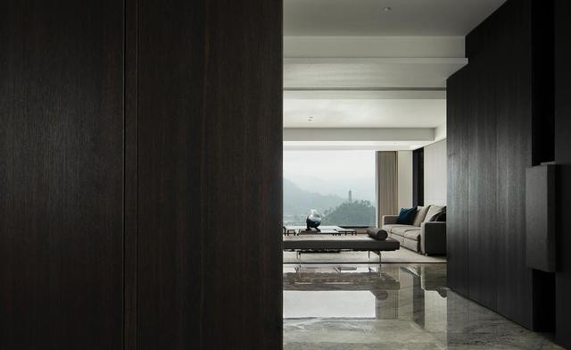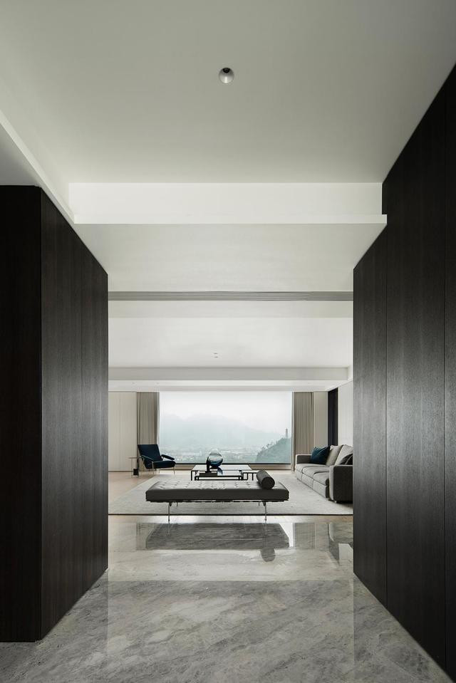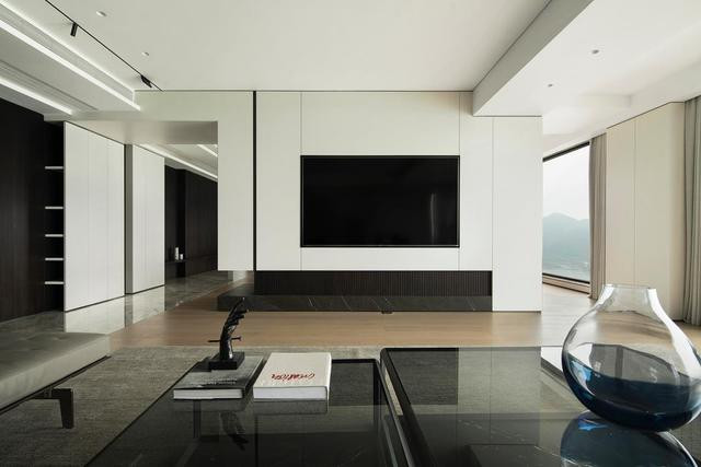 设计师巧妙地将两套大平层打通,形成了一个宽敞通透的生活空间。一进入豪宅,首先映入眼帘的便是那面巨大的落地窗,它将室外的山水美景尽收眼底,仿佛一幅流动的画卷。