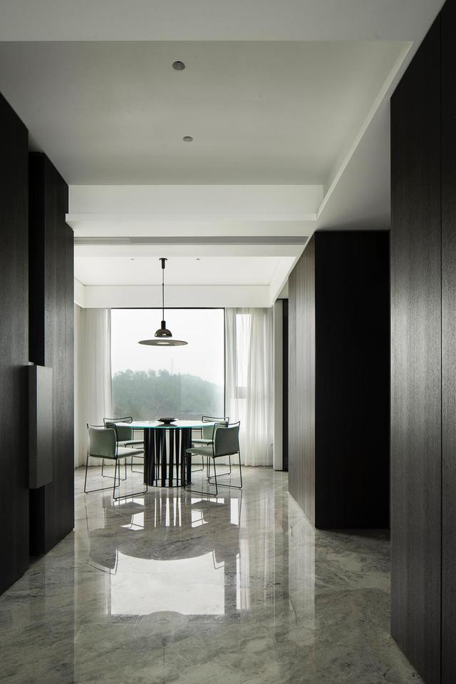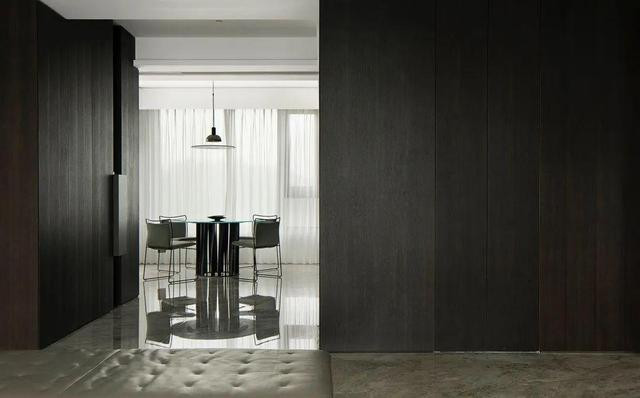 黑胡桃木的材质搭配无把手的柜门设计,不仅彰显了高级感,更在细节中流露出温暖与美好。随着光线的变化,玄关空间也呈现出不同的韵味,仿佛每一处都充满了生命力。