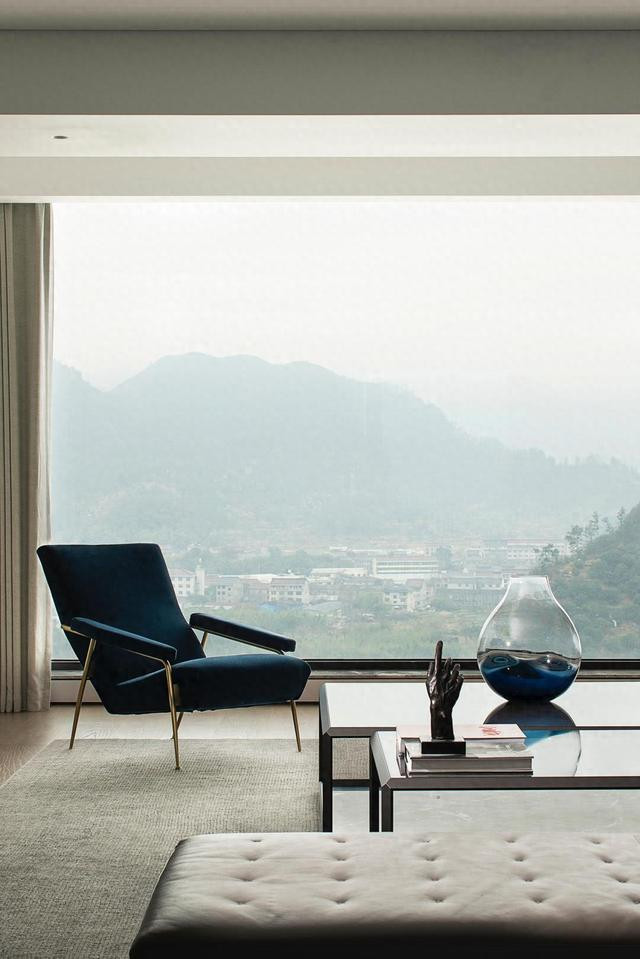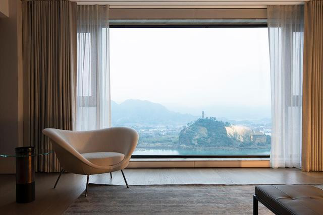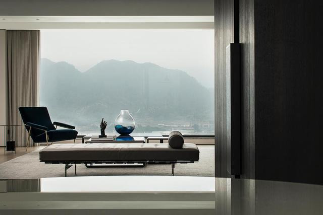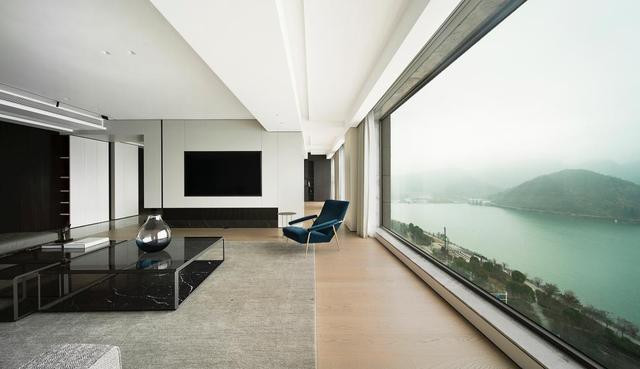 步入客厅,更是让人眼前一亮。长达3米多的落地玻璃窗将整个空间照亮,湖景、山景、云景如同画卷般在室内展开。