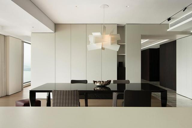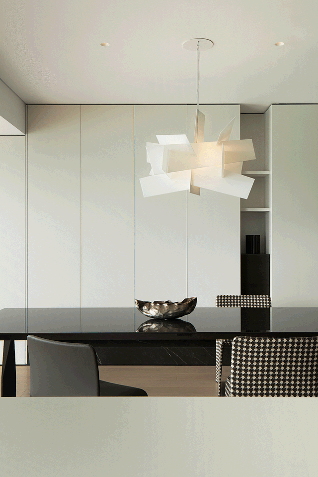 轻盈清雅的氛围中,几何铁艺线条的餐椅与亚克力材质的餐桌相得益彰,共同营造出一种悬浮般的高级感。